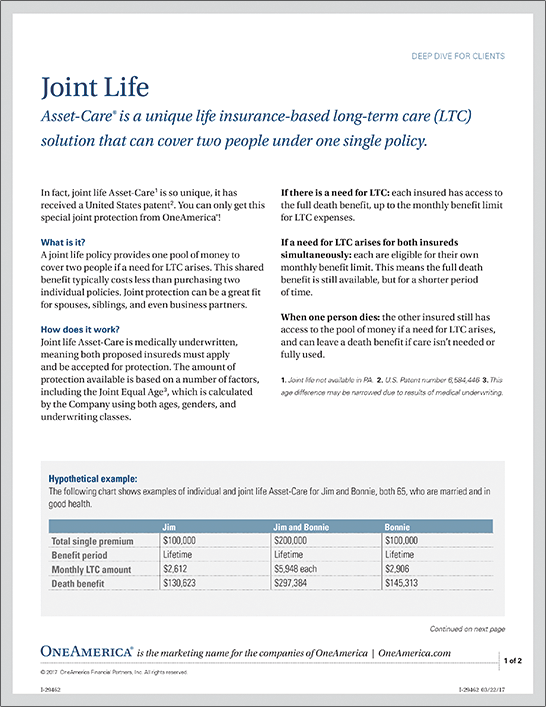 With each product type, you have multiple ways to fund your coverage. To help you understand your choices, these brochures go into a deeper level of information than the core brochures. The content covers product highlights, hypothetical examples, benefit triggers and protection-enhancing policy riders.