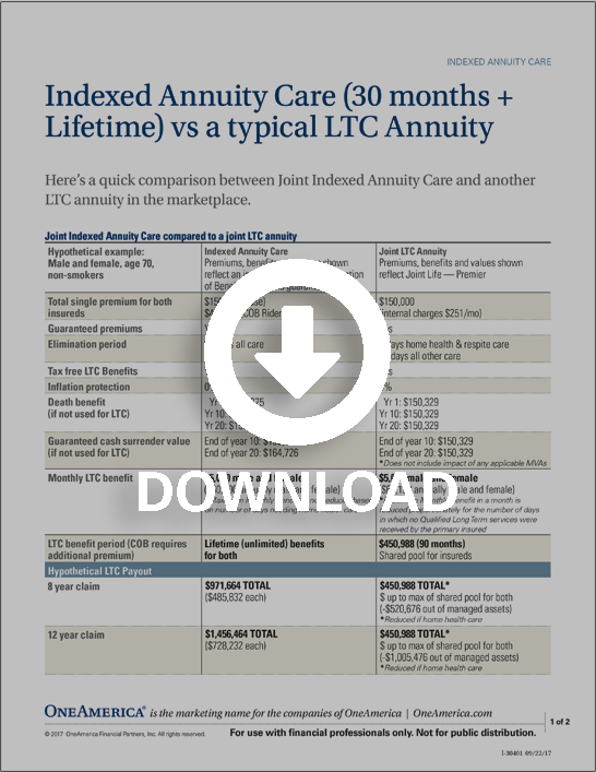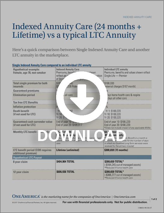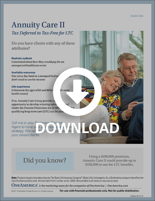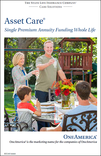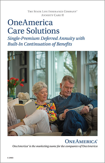 Note: Products are issued and underwritten by The State Life Insurance Company® (State Life), Indianapolis, IN, a OneAmerica company that offers the Care Solutions product suite. Asset Care Form number series: ICC18 L302 SP, ICC18 L302 SP JT, ICC18 R537, ICC18 R538, ICC18 R532, and ICC18 R533; Annuity Care and Annuity Care II form numbers: SA34, R508; SA35; Indexed Annuity Care form numbers: SA36, R529 PPA, R529, R530 PPA and R530. Not available in all states or may vary by state. All guarantees are subject to the claims-paying ability of State Life.