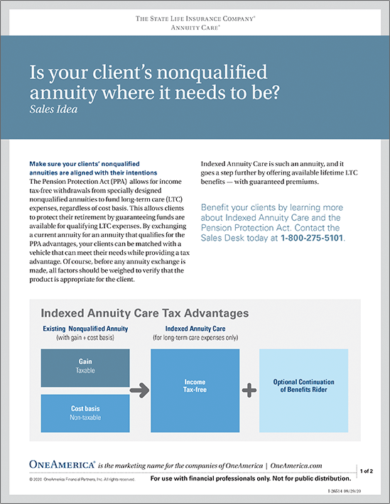 Learn how your clients can receive Indexed Annuity Care’s tax advantages for LTC benefits.